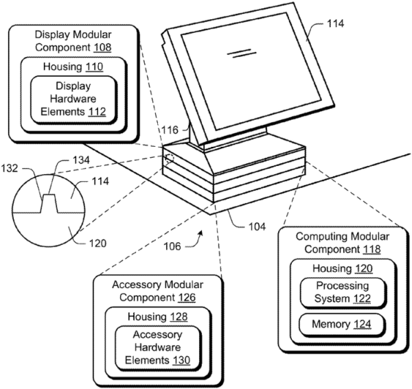 Microsoft filed last summer,  patent application describes a modular desktop device, which resembles in concept easily upgradeable monoblock.  The layout of the system is such that all the plugins are installed on one another under the monitor, and fixed using magnetic holders.