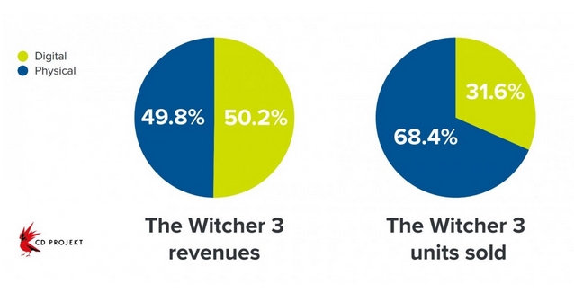 According to the chart, only 31.6% of copies of The Witcher 3 were sold in digital form , while 68.4% account for the physical sale copies  .  If we compare this fact with the fact that a third of all games sold The Witcher 3 falls on the PC, and two-thirds - in the console, it can be concluded that on game consoles still dominate.