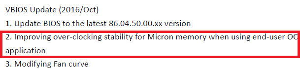 The accompanying note explains that this update improves the stability of the GeForce GTX 1070 Micron memory chips during overclock. Also, the fan has corrected profile.