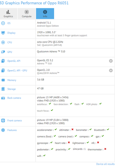 Also in GFXBench it is indicated that Oppo R6051 is equipped with 5.5-inch display with a resolution of 1920x1080 pixels and has support for Wi-Fi, Bluetooth and GPS.  It runs under the mobile operating system Android 7.1.1 Nougat.