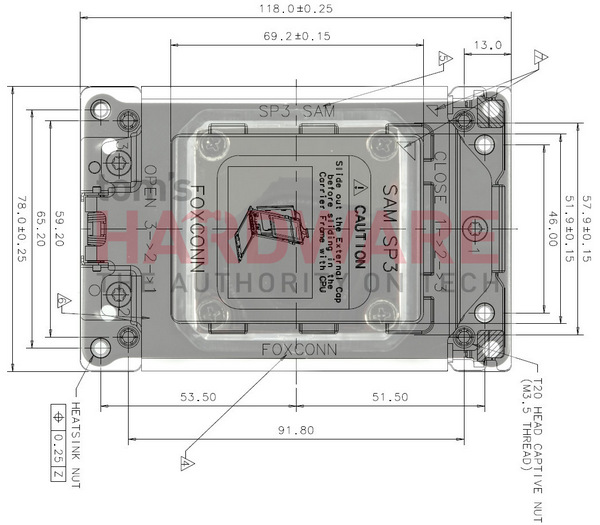 In the image above you can see the result of overlaying drawing of the processor socket on the cooling system . The first thing is the asymmetrical arrangement of the fastening holes. To the left they are located at a distance of 65.2 mm from each other, and to the right ¬- only 46 mm. Also, judging by everything, cooling systems with a square base, for example, Alphacool waterblocks, will have an advantage over solutions with a round base, for example, ASEUK water blocks.