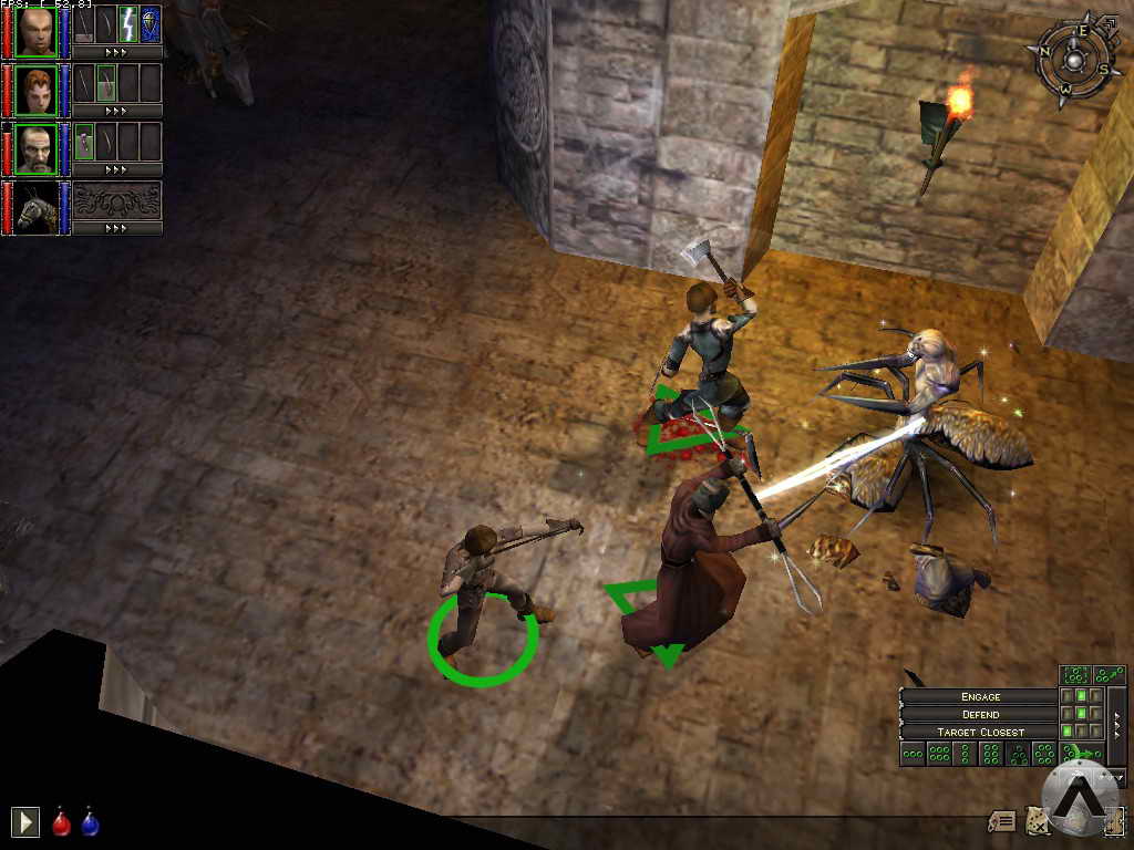 The bottom right corner offers character AI settings and formation controls. It is a bit more cryptic, but still compact and highly functional. Formations can be dynamically adjusted by holding the right mouse button and moving the mouse to rotate the formation, or by turning the mousewheel to tighten or loosen it. Dungeon Siege also includes a highly functional map screen accessed through the Tab key. The map is simply a bird\'s eye view of the action, with stylized representations of characters, enemies, and treasure for easy identification. Any type of orders can be issued from the map screen, including battle and movement commands.