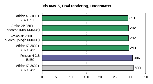 The diagram above shows the time each of the tested system required to perform final rendering of a scene. The smaller value indicates higher performance. In 3ds MAX 5 Athlon XP 2800+ managed to cope with the final rendering noticeably faster.