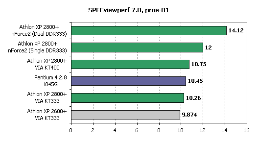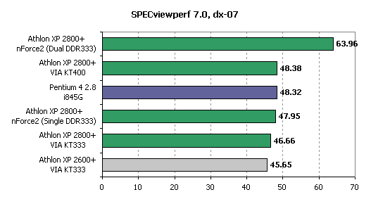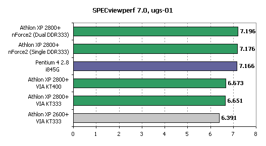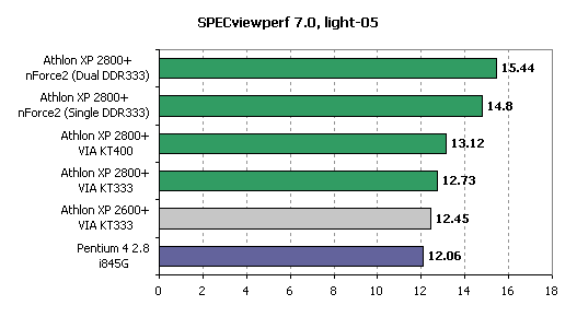 Professional SPECviewperf test package is an excellent benchmark for different memory subsystems. Therefore, no wonder that nForce2 appeared almost phenomenally fast sometimes. In general, the advantage of Athlon XP 2800+ over Pentium 4 2.8GHz can be explained by the fact that professional OpenGL applications included into this package are very much dependent on the computational capacity of the CPU without involving any SSE2 instructions.