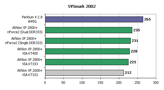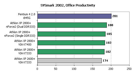 Even though AMD doesn\'t like SYSmark2002 test package, we ran it for the new platforms. As we have expected, Pentium 4 turned out the leader here. However, there is another very interesting thing. The new NVIDIA nForce2 chipset proved to be stably ahead of the competing solutions from VIA. It means that NVIDIA managed to optimize the memory controller in nForce2 quite a bit, so that its dual-channel architecture as well as DASP technology support let nForce2 outpace the rivals.