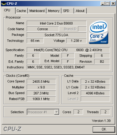 This was the screen shot of CPUZ for default Intel core 2 Duo E6600 2400MHz .
