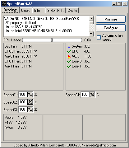 Obviously, certain sensors are badly interpreted by Speedfan here, because of 119°C temperatures do not correspond to any realistic value. even if this software is particularly powerful , there remain some errors. In these rare cases, it will be necessary to find the correspondence between the sensors and elements (processor, motherboard,…).